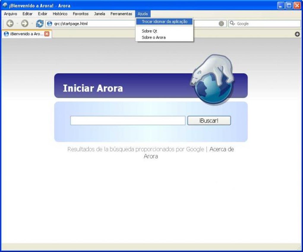 Para deixar o Arora em português, clique no menu “Ajuda” e selecione a opção correspondente. O Arora permite navegar por abas e traz um mecanismo que faz sugestões automáticas para as suas buscas. Não faltam um gerenciador de downloads e um menu de favoritos.